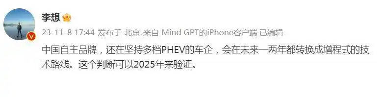 在2023年的时候,理想汽车创始人李想曾经公开表达过一个观点,到了2025年的时候,国内主打多挡插混的自主品牌车企,很多都将转变为增程式电动车或者单挡插混!当时此言一出,在业界遭到了一顿抨击,因为在当时,多挡插混如日中天,没有人会相信,亏电油耗很高、被称为“脱裤子放屁”的增程式电动车能成为主流技术……